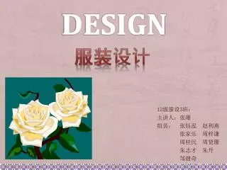 服装设计 Design 12级服设3班: 主讲人:张珊 组员: 张钰泓 赵利燕 张家乐 周梓谦 周桂民 周贤珊 朱志才 朱丹 邹健奇
