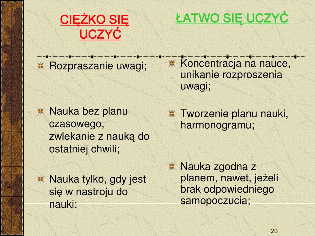 CIĘŻKO SIĘ UCZYĆ Rozpraszanie uwagi; Nauka bez planu czasowego, zwlekanie z nauką do ostatniej chwili; Nauka tylko, gdy jest się w nastroju do nauki; ŁATWO SIĘ UCZYĆ Koncentracja na nauce, unikanie rozproszenia uwagi; Tworzenie planu nauki, harmonogramu; Nauka zgodna z planem, nawet, jeżeli brak odpowiedniego samopoczucia;