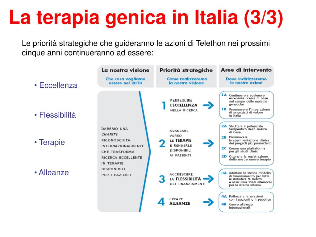 La terapia genica in Italia (3/3) Le priorità strategiche che guideranno le azioni di Telethon nei prossimi cinque anni continueranno ad essere: • Eccellenza • Flessibilità • Terapie • Alleanze