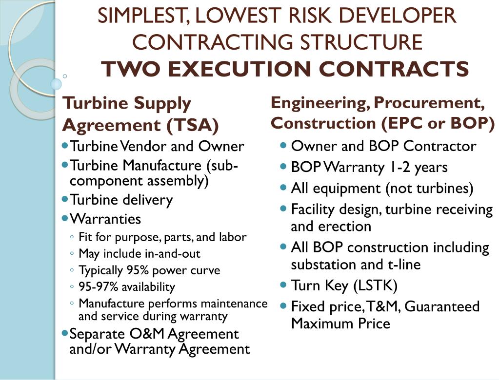 Engineering, Procurement, Construction (EPC or BOP) SIMPLEST, LOWEST RISK DEVELOPER CONTRACTING STRUCTURE TWO EXECUTION CONTRACTS Turbine Supply Agreement (TSA) • Turbine Vendor and Owner • Turbine Manufacture (sub-component assembly) • Turbine delivery • Warranties • Fit for purpose, parts, and labor • May include in-and-out • Typically 95% power curve • 95-97% availability • Manufacture performs maintenance and service during warranty • Separate O&M Agreement and/or Warranty Agreement Owner and BOP Contractor BOP Warranty 1-2 years All equipment (not turbines) Facility design, turbine receiving and erection All BOP construction including substation and t-line Turn Key (LSTK) Fixed price, T&M, Guaranteed Maximum Price