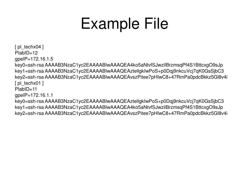 Example File [ pl_techx04 ] PlabID=12 gpeIP=172.16.1.5 key0=ssh-rsa AAAAB3NzaC1yc2EAAAABIwAAAQEA4ko5aNtvfSJwzilBrzmsqPf4S1BttcxgO9sJp key1=ssh-rsa AAAAB3NzaC1yc2EAAAABIwAAAQEAztellgkIwPoS+p0Dqj9nkcuVcj7qK0GsSjbC3 key2=ssh-rsa AAAAB3NzaC1yc2EAAAABIwAAAQEAvszPitee7pHIwC8+47RmPa0pdcBkkz5Gl8v4i [ pl_techx01 ] PlabID=11 gpeIP=172.16.1.1 key0=ssh-rsa AAAAB3NzaC1yc2EAAAABIwAAAQEAztellgkIwPoS+p0Dqj9nkcuVcj7qK0GsSjbC3 key1=ssh-rsa AAAAB3NzaC1yc2EAAAABIwAAAQEA4ko5aNtvfSJwzilBrzmsqPf4S1BttcxgO9sJp key2=ssh-rsa AAAAB3NzaC1yc2EAAAABIwAAAQEAvszPitee7pHIwC8+47RmPa0pdcBkkz5Gl8v4i