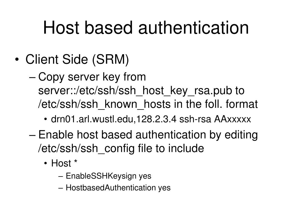 Host based authentication • Client Side (SRM) • Copy server key from server::/etc/ssh/ssh_host_key_rsa.pub to /etc/ssh/ssh_known_hosts in the foll. format • drn01.arl.wustl.edu,128.2.3.4 ssh-rsa AAxxxxx • Enable host based authentication by editing /etc/ssh/ssh_config file to include • Host * • EnableSSHKeysign yes • HostbasedAuthentication yes