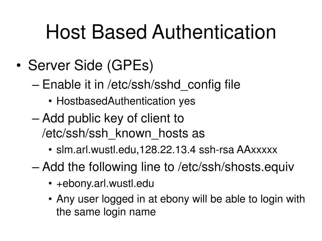 Host Based Authentication • Server Side (GPEs) • Enable it in /etc/ssh/sshd_config file • HostbasedAuthentication yes • Add public key of client to /etc/ssh/ssh_known_hosts as • slm.arl.wustl.edu,128.22.13.4 ssh-rsa AAxxxxx • Add the following line to /etc/ssh/shosts.equiv • +ebony.arl.wustl.edu • Any user logged in at ebony will be able to login with the same login name