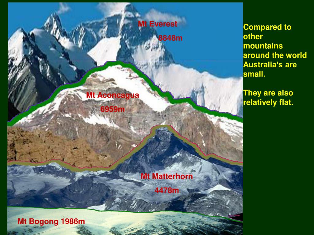 Mt Everest 8848m Compared to other mountains around the world Australia’s are small. They are also relatively flat. Mt Aconcagua 6959m Mt Matterhorn 4478m Mt Bogong 1986m