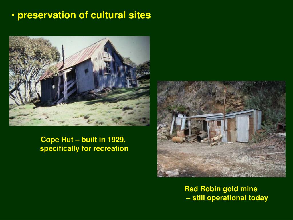 preservation of cultural sites Cope Hut – built in 1929, specifically for recreation Red Robin gold mine – still operational today
