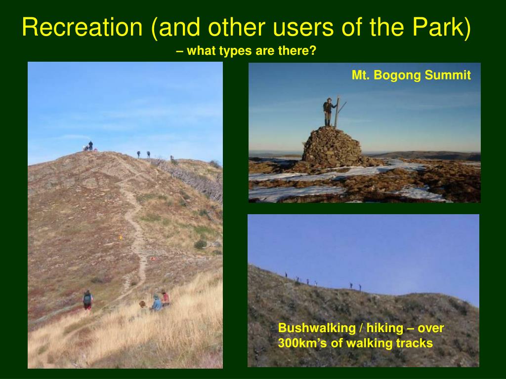 Recreation (and other users of the Park)– what types are there? Mt. Bogong Summit Bushwalking / hiking – over 300km’s of walking tracks