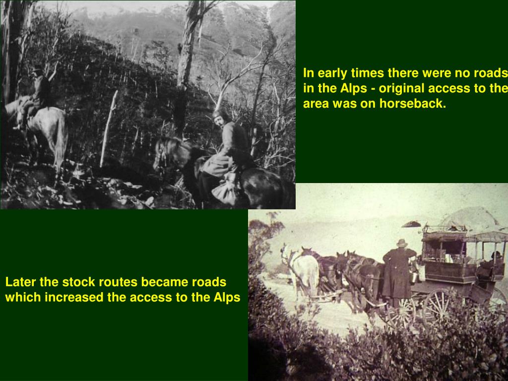 In early times there were no roads in the Alps - original access to the area was on horseback. Later the stock routes became roads which increased the access to the Alps