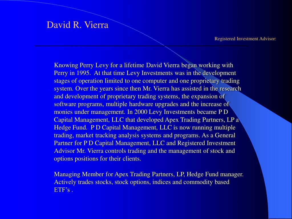 Knowing Perry Levy for a lifetime David Vierra began working with Perry in 1995. At that time Levy Investments was in the development stages of operation limited to one computer and one proprietary trading system. Over the years since then Mr. Vierra has assisted in the research and development of proprietary trading systems, the expansion of software programs, multiple hardware upgrades and the increase of monies under management. In 2000 Levy Investments became P D Capital Management, LLC that developed Apex Trading Partners, LP a Hedge Fund. P D Capital Management, LLC is now running multiple trading, market tracking analysis systems and programs. As a General Partner for P D Capital Management, LLC and Registered Investment Advisor Mr. Vierra controls trading and the management of stock and options positions for their clients. Managing Member for Apex Trading Partners, LP, Hedge Fund manager. Actively trades stocks, stock options, indices and commodity based ETF’s . David R. Vierra ____________________________________________ Registered Investment Advisor: