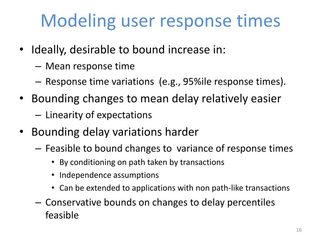 Modeling user response times • Ideally, desirable to bound increase in: • Mean response time • Response time variations (e.g., 95%ile response times). • Bounding changes to mean delay relatively easier • Linearity of expectations • Bounding delay variations harder • Feasible to bound changes to variance of response times • By conditioning on path taken by transactions • Independence assumptions • Can be extended to applications with non path-like transactions • Conservative bounds on changes to delay percentiles feasible