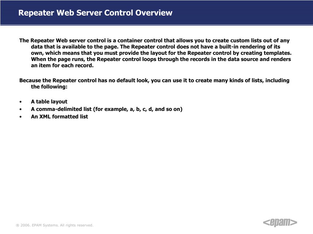 Repeater Web Server Control Overview • The Repeater Web server control is a container control that allows you to create custom lists out of any data that is available to the page. The Repeater control does not have a built-in rendering of its own, which means that you must provide the layout for the Repeater control by creating templates. When the page runs, the Repeater control loops through the records in the data source and renders an item for each record. • Because the Repeater control has no default look, you can use it to create many kinds of lists, including the following: • A table layout • A comma-delimited list (for example, a, b, c, d, and so on) • An XML formatted list