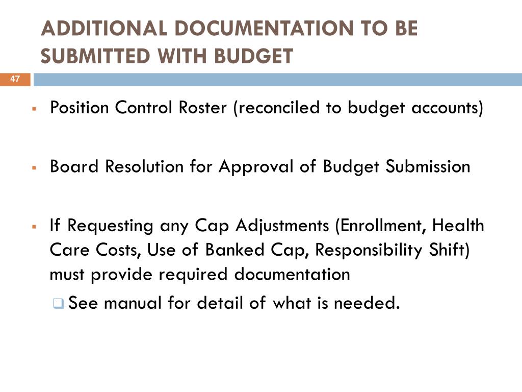 ADDITIONAL DOCUMENTATION TO BE SUBMITTED WITH BUDGET • Position Control Roster (reconciled to budget accounts) • Board Resolution for Approval of Budget Submission • If Requesting any Cap Adjustments (Enrollment, Health Care Costs, Use of Banked Cap, Responsibility Shift) must provide required documentation • See manual for detail of what is needed.