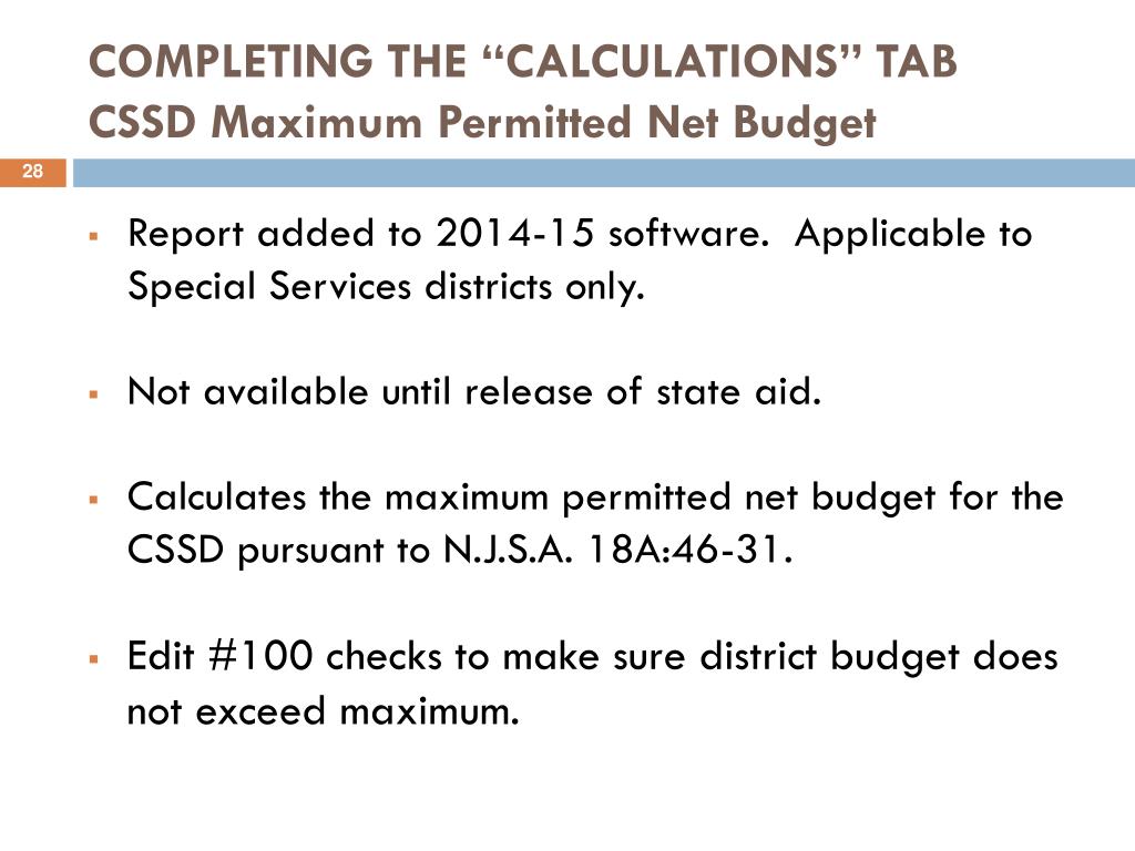 COMPLETING THE “CALCULATIONS” TABCSSD Maximum Permitted Net Budget • Report added to 2014-15 software. Applicable to Special Services districts only. • Not available until release of state aid. • Calculates the maximum permitted net budget for the CSSD pursuant to N.J.S.A. 18A:46-31. • Edit #100 checks to make sure district budget does not exceed maximum.