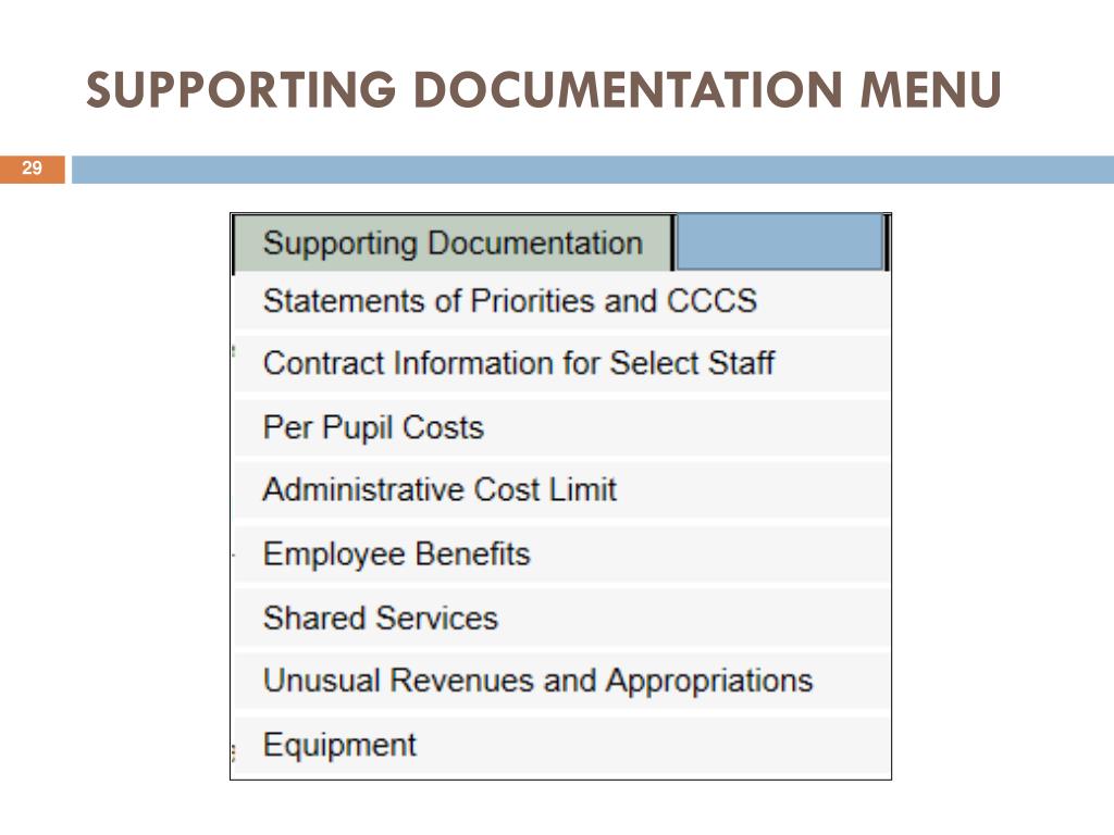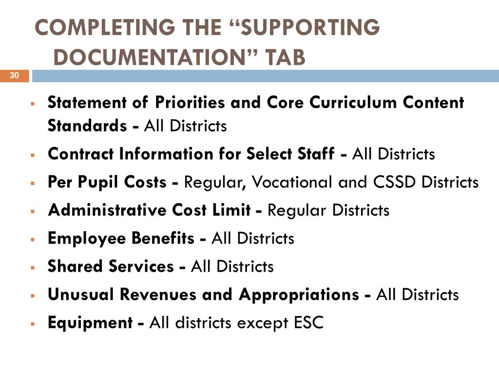 COMPLETING THE “SUPPORTING DOCUMENTATION” TAB • Statement of Priorities and Core Curriculum Content Standards - All Districts • Contract Information for Select Staff - All Districts • Per Pupil Costs - Regular, Vocational and CSSD Districts • Administrative Cost Limit - Regular Districts • Employee Benefits - All Districts • Shared Services - All Districts • Unusual Revenues and Appropriations- All Districts • Equipment- All districts except ESC
