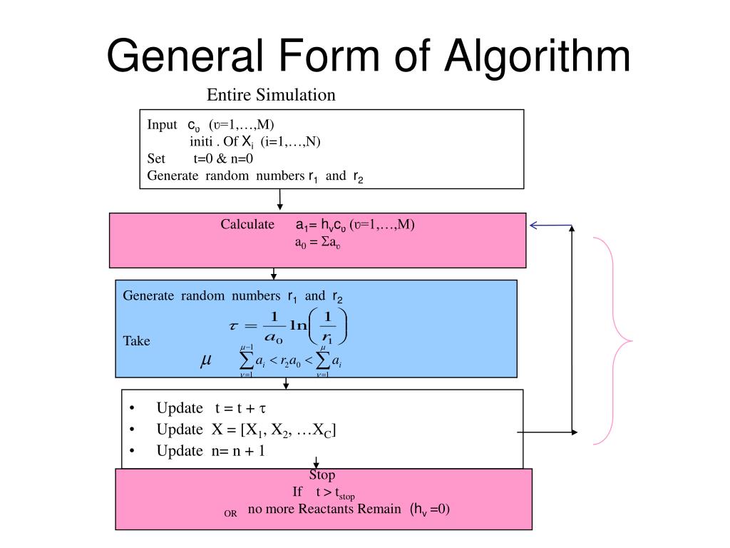 Entire Simulation Input cʋ (ʋ=1,…,M) initi . Of Xi (i=1,…,N) Set t=0 & n=0 Generate random numbers r1 and r2 Calculate a1= hvcʋ (ʋ=1,…,M) a0 = aʋ Generate random numbers r1 and r2 Take • Update t = t + t • Update X = [X1, X2, …XC] • Update n= n + 1 General Form of Algorithm Stop If t > tstop OR no more Reactants Remain (hv =0)
