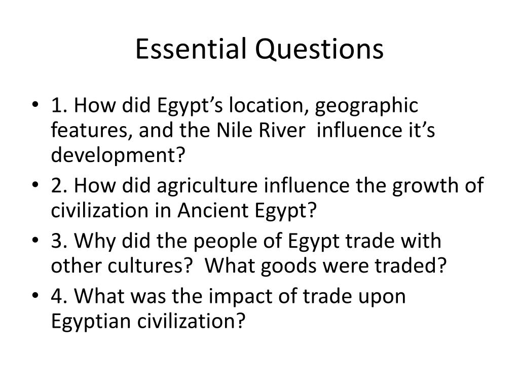 Essential Questions • 1. How did Egypt’s location, geographic features, and the Nile River influence it’s development? • 2. How did agriculture influence the growth of civilization in Ancient Egypt? • 3. Why did the people of Egypt trade with other cultures? What goods were traded? • 4. What was the impact of trade upon Egyptian civilization?