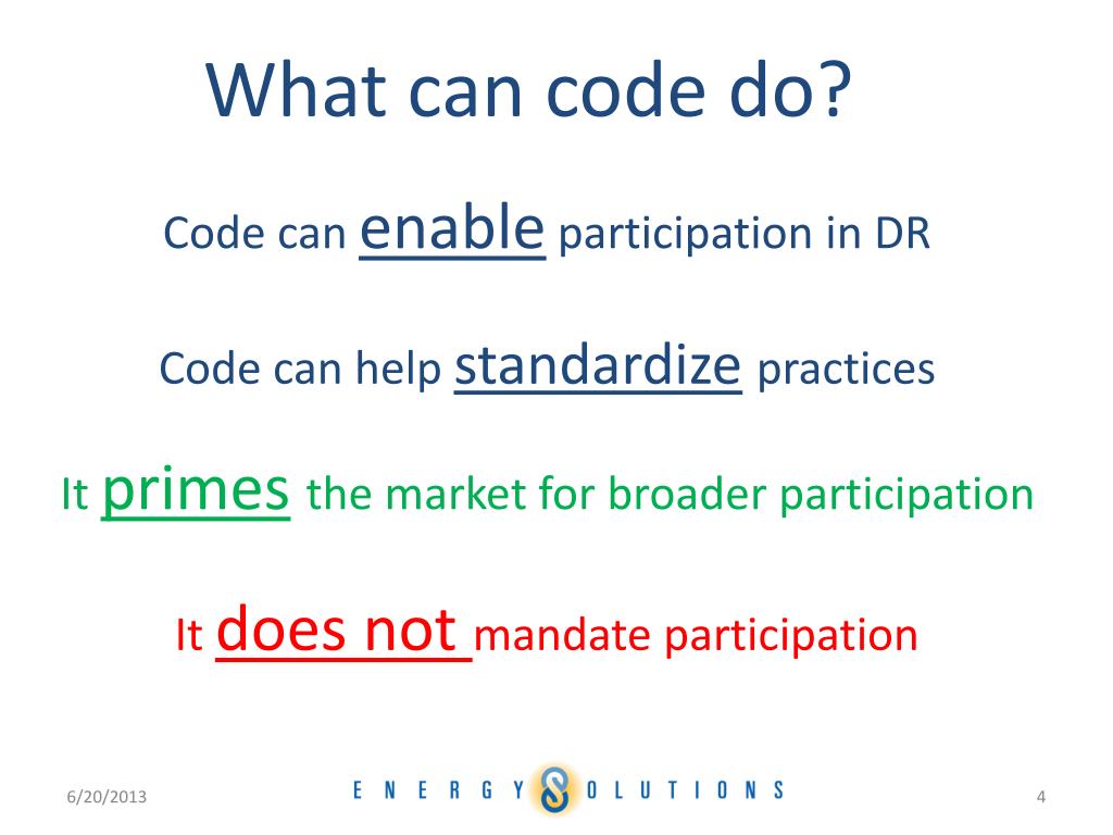 What can code do? Code can enable participation in DRCode can help standardizepractices It primesthe market for broader participationIt does not mandate participation