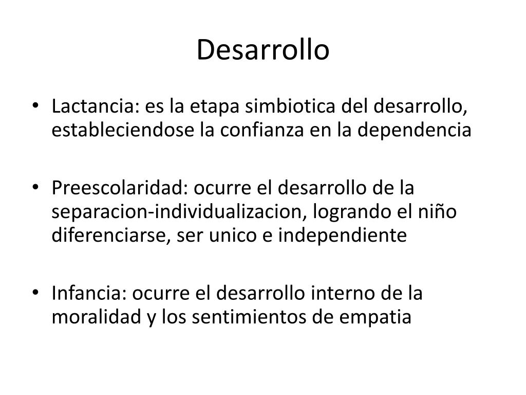 Desarrollo • Lactancia: es la etapasimbiotica del desarrollo, estableciendose la confianza en la dependencia • Preescolaridad: ocurre el desarrollo de la separacion-individualizacion, logrando el niñodiferenciarse, serunico e independiente • Infancia: ocurre el desarrollointerno de la moralidad y los sentimientos de empatia