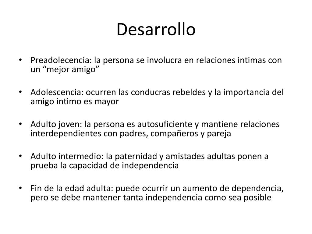 Desarrollo • Preadolecencia: la persona se involucra en relacionesintimas con un “mejor amigo” • Adolescencia: ocurrenlasconducrasrebeldes y la importancia del amigo intimoes mayor • Adultojoven: la persona esautosuficiente y mantienerelacionesinterdependientes con padres, compañeros y pareja • Adultointermedio: la paternidad y amistadesadultasponen a prueba la capacidad de independencia • Fin de la edadadulta: puedeocurrir un aumento de dependencia, pero se debemantenertantaindependenciacomo sea posible