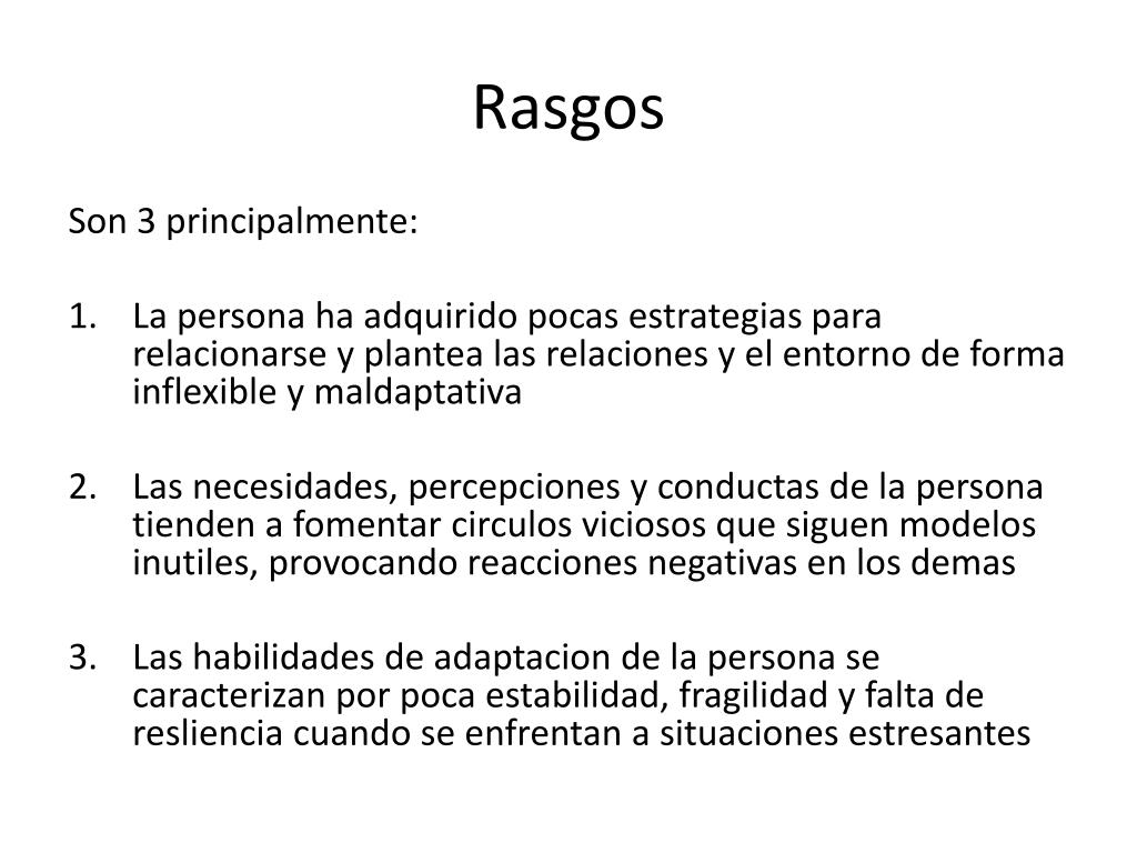 Rasgos Son 3 principalmente: • La persona ha adquiridopocasestrategias para relacionarse y plantealasrelaciones y el entorno de forma inflexible y maldaptativa • Las necesidades, percepciones y conductas de la persona tienden a fomentarcirculosviciososquesiguenmodelosinutiles, provocandoreaccionesnegativas en los demas • Las habilidades de adaptacion de la persona se caracterizanporpocaestabilidad, fragilidad y falta de reslienciacuando se enfrentan a situacionesestresantes