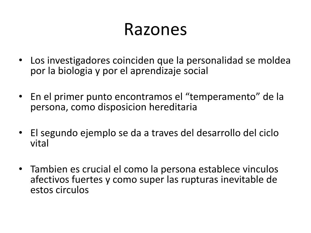 Razones • Los investigadorescoincidenque la personalidad se moldeapor la biologia y por el aprendizaje social • En el primer puntoencontramos el “temperamento” de la persona, comodisposicionhereditaria • El segundoejemplo se da a traves del desarrollo del ciclo vital • Tambien es crucial el como la persona establecevinculosafectivosfuertes y como super lasrupturas inevitable de estoscirculos