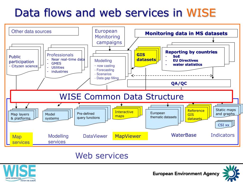 Data flows and web services in WISE European Monitoring campaigns Other data sources Monitoring data in MS datasets • Reporting by countries • SoE • EU Directives • waterstatistics GIS datasets • Professionals • Near real-time data • GMES • Utilities • industries • Public participation • Cityzen science Modelling - now casting - Forecasting - Scenarios - Data gap filling QA/QC WISE Common Data Structure Reference GIS datasets Static maps and graphs Interactive maps Map layers & platforms Model systems European thematic datasets Pre-defined query functions CSI xx WaterBase Indicators Modelling services DataViewer MapViewer Map services Web services