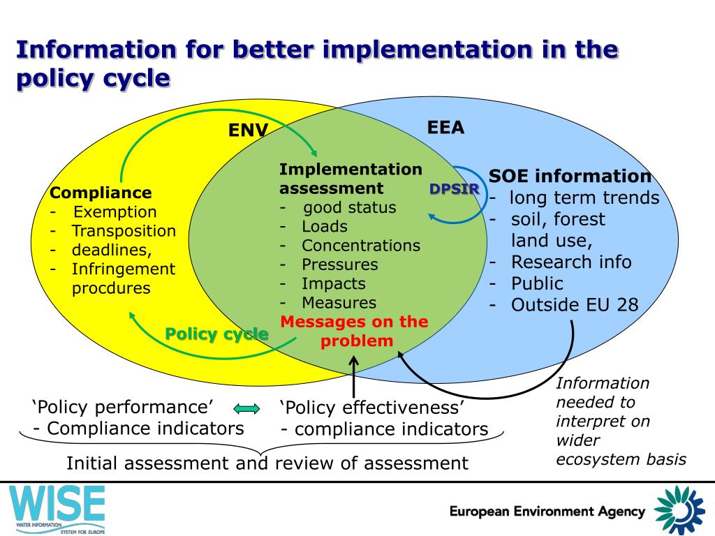 Information for better implementation in the policy cycle EEA ENV • Implementation assessment- goodstatus • Loads • Concentrations • Pressures • Impacts • Measures • Messages on theproblem • SOE information- longtermtrends • soil, forestlanduse, • Research info • Public • Outside EU 28 • Compliance- Exemption • Transposition • deadlines, • Infringementprocdures DPSIR Policycycle Information neededtointerpret on wider ecosystembasis ‘Policy performance’ - Compliance indicators ‘Policy effectiveness’- compliance indicators Initial assessmentandreviewofassessment