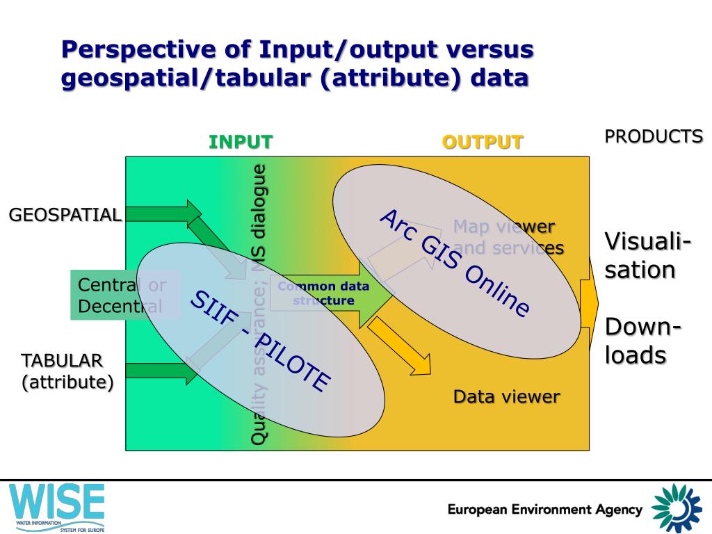Perspectiveof Input/output versus geospatial/tabular (attribute) data PRODUCTS INPUT OUTPUT Arc GIS Online GEOSPATIAL Mapviewerandservices Visuali-sationDown-loads Common datastructure Central orDecentral SIIF - PILOTE Quality assurance; MS dialogue TABULAR(attribute) Data viewer