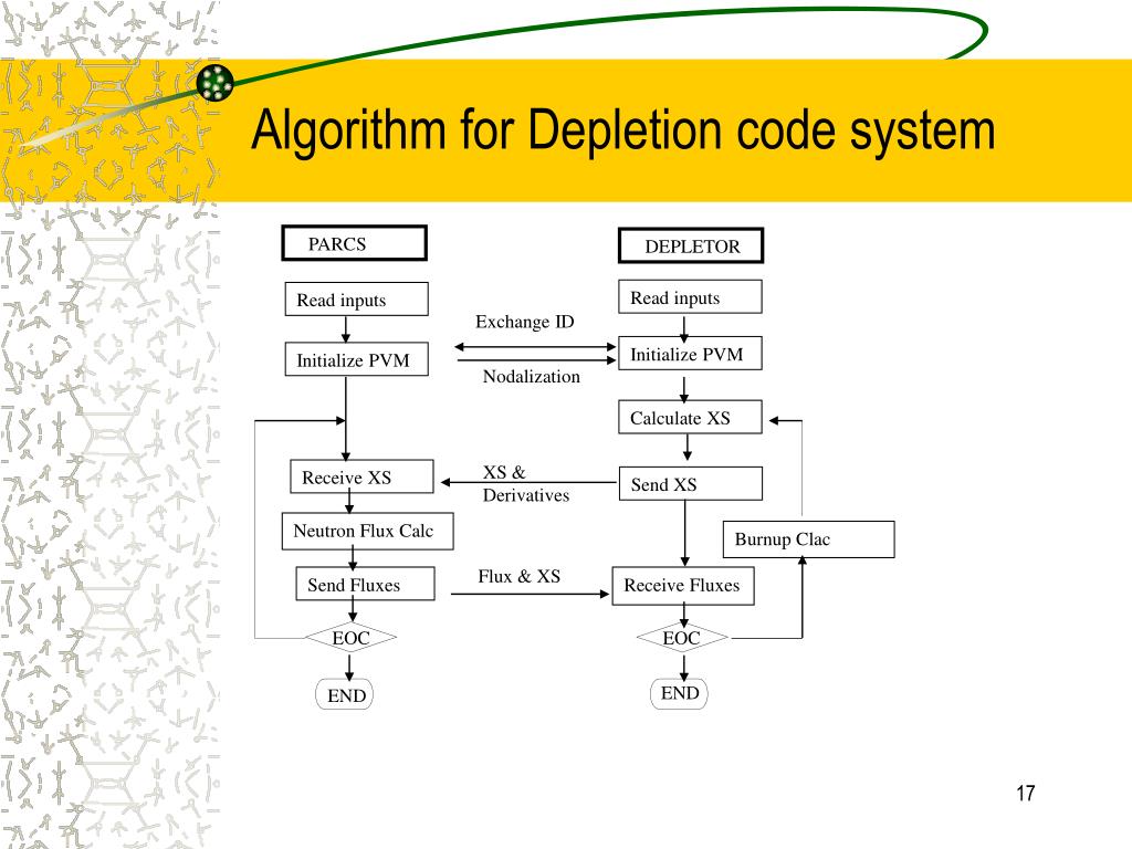 PARCS DEPLETOR Read inputs Read inputs Exchange ID Initialize PVM Initialize PVM Nodalization Calculate XS XS & Derivatives Receive XS Send XS Neutron Flux Calc Burnup Clac Flux & XS Send Fluxes Receive Fluxes EOC EOC END END Algorithm for Depletion code system