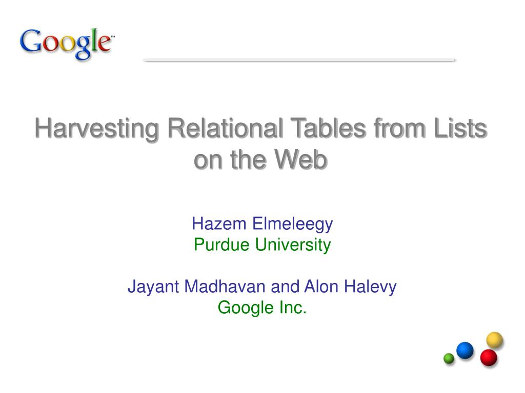 Harvesting Relational Tables from Lists on the Web Hazem Elmeleegy Purdue University Jayant Madhavan and Alon Halevy Google Inc.