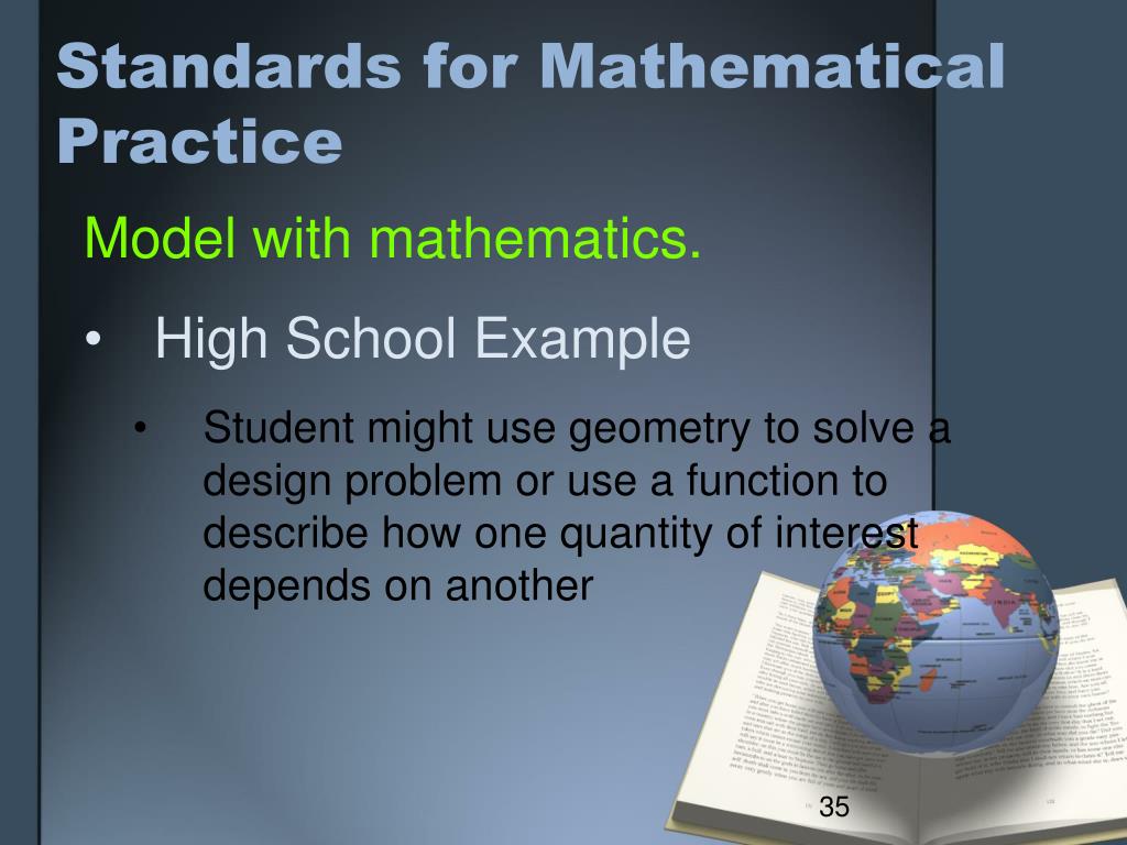Standards for Mathematical Practice Model with mathematics. • High School Example • Student might use geometry to solve a design problem or use a function to describe how one quantity of interest depends on another