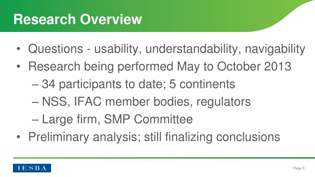 Research Overview • Questions - usability, understandability, navigability • Research being performed May to October 2013 • 34 participants to date; 5 continents • NSS, IFAC member bodies, regulators • Large firm, SMP Committee • Preliminary analysis; still finalizing conclusions