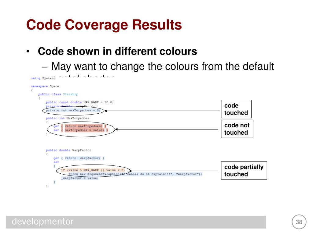 code touched code not touched code partially touched Code Coverage Results • Code shown in different colours • May want to change the colours from the default pastel shades