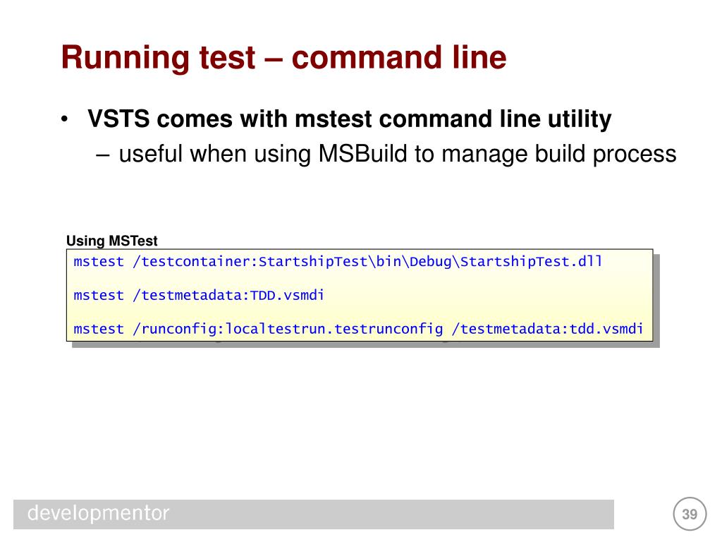 Using MSTest mstest /testcontainer:StartshipTest\bin\Debug\StartshipTest.dll mstest /testmetadata:TDD.vsmdi mstest /runconfig:localtestrun.testrunconfig /testmetadata:tdd.vsmdi Running test – command line • VSTS comes with mstest command line utility • useful when using MSBuild to manage build process