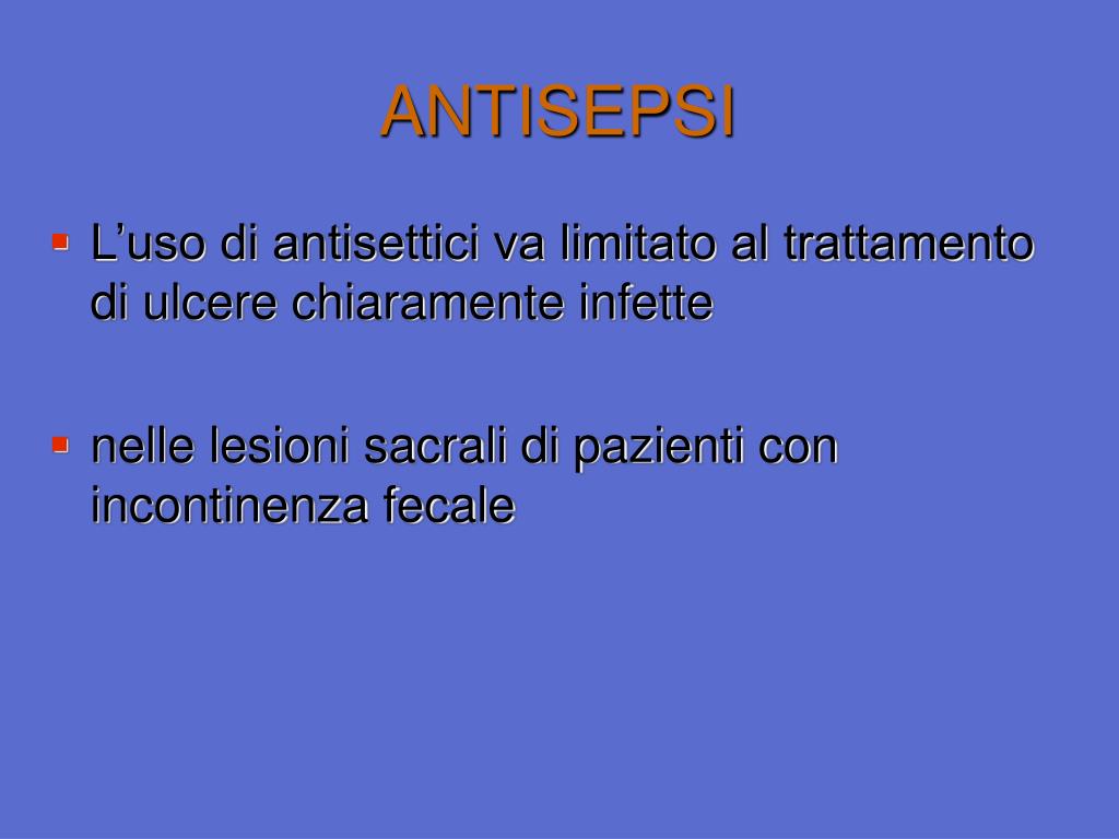 ANTISEPSI • L’uso di antisettici va limitato al trattamento di ulcere chiaramente infette • nelle lesioni sacrali di pazienti con incontinenza fecale