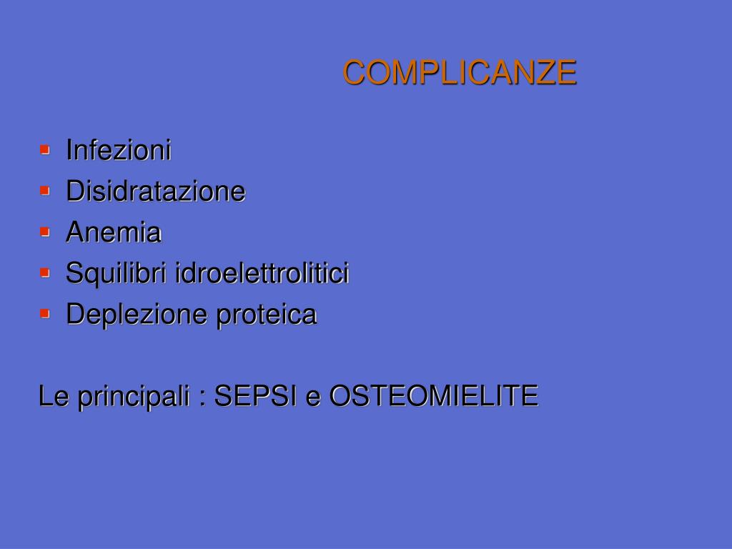 COMPLICANZE • Infezioni • Disidratazione • Anemia • Squilibri idroelettrolitici • Deplezione proteica Le principali : SEPSI e OSTEOMIELITE