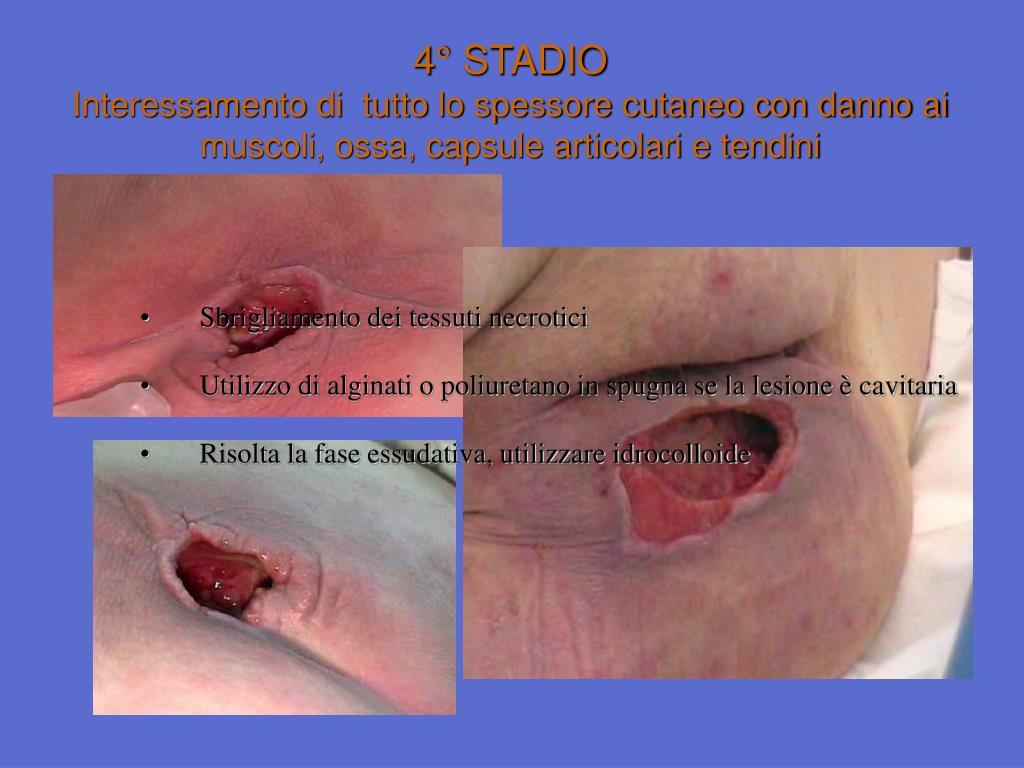 4° STADIOInteressamento di tutto lo spessore cutaneo con danno ai muscoli, ossa, capsule articolari e tendini • Sbrigliamento dei tessuti necrotici • Utilizzo di alginati o poliuretano in spugna se la lesione è cavitaria • Risolta la fase essudativa, utilizzare idrocolloide