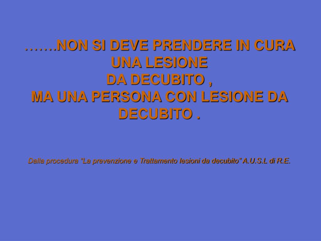 …….NON SI DEVE PRENDERE IN CURA UNA LESIONEDA DECUBITO ,MA UNA PERSONA CON LESIONE DA DECUBITO . Dalla procedura “La prevenzione e Trattamento lesioni da decubito” A.U.S.L di R.E.