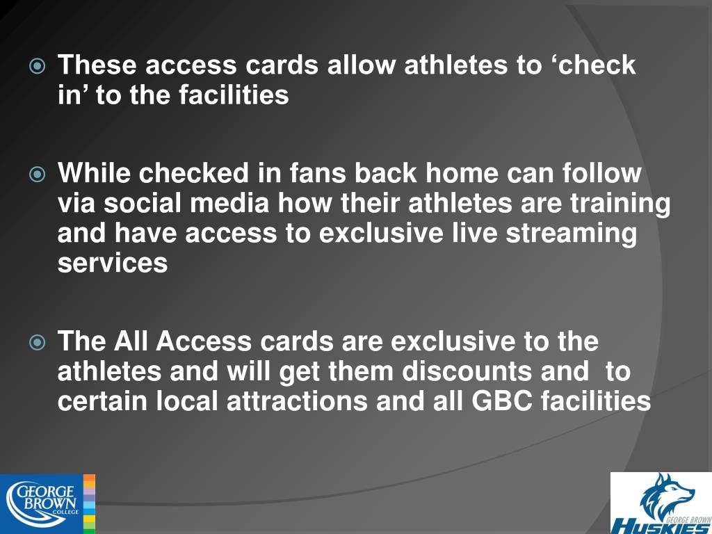 These access cards allow athletes to ‘check in’ to the facilities • While checked in fans back home can follow via social media how their athletes are training and have access to exclusive live streaming services • The All Access cards are exclusive to the athletes and will get them discounts and to certain local attractions and all GBC facilities