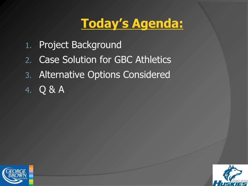 Today’s Agenda: • Project Background • Case Solution for GBC Athletics • Alternative Options Considered • Q & A