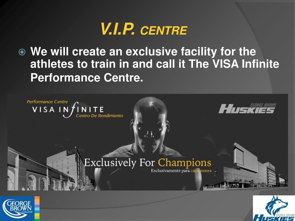 VIP Treatment • The athletes will receive exclusive VIP treatment while training at the VISA Infinite Performance Centre. We will provide everything from complementary towel service to student ambassadors.