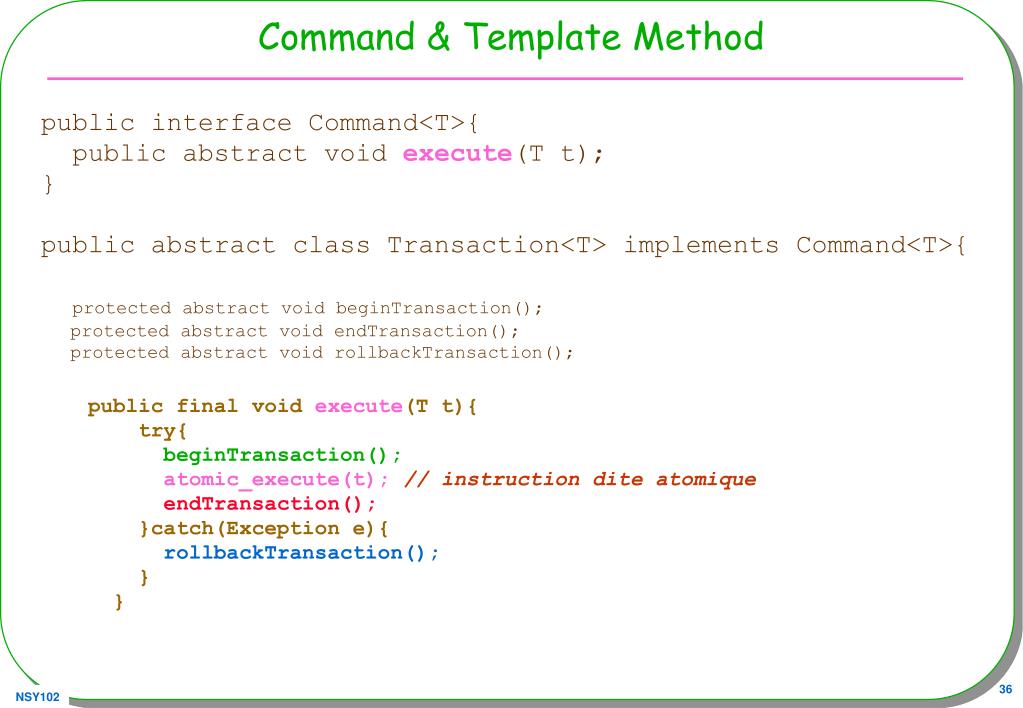 Command & Template Method public interface Command<T>{ public abstract void execute(T t); } public abstract class Transaction<T> implements Command<T>{ protected abstract void beginTransaction(); protected abstract void endTransaction(); protected abstract void rollbackTransaction(); public final void execute(T t){ try{ beginTransaction(); atomic_execute(t); // instruction dite atomique endTransaction(); }catch(Exception e){ rollbackTransaction(); } }