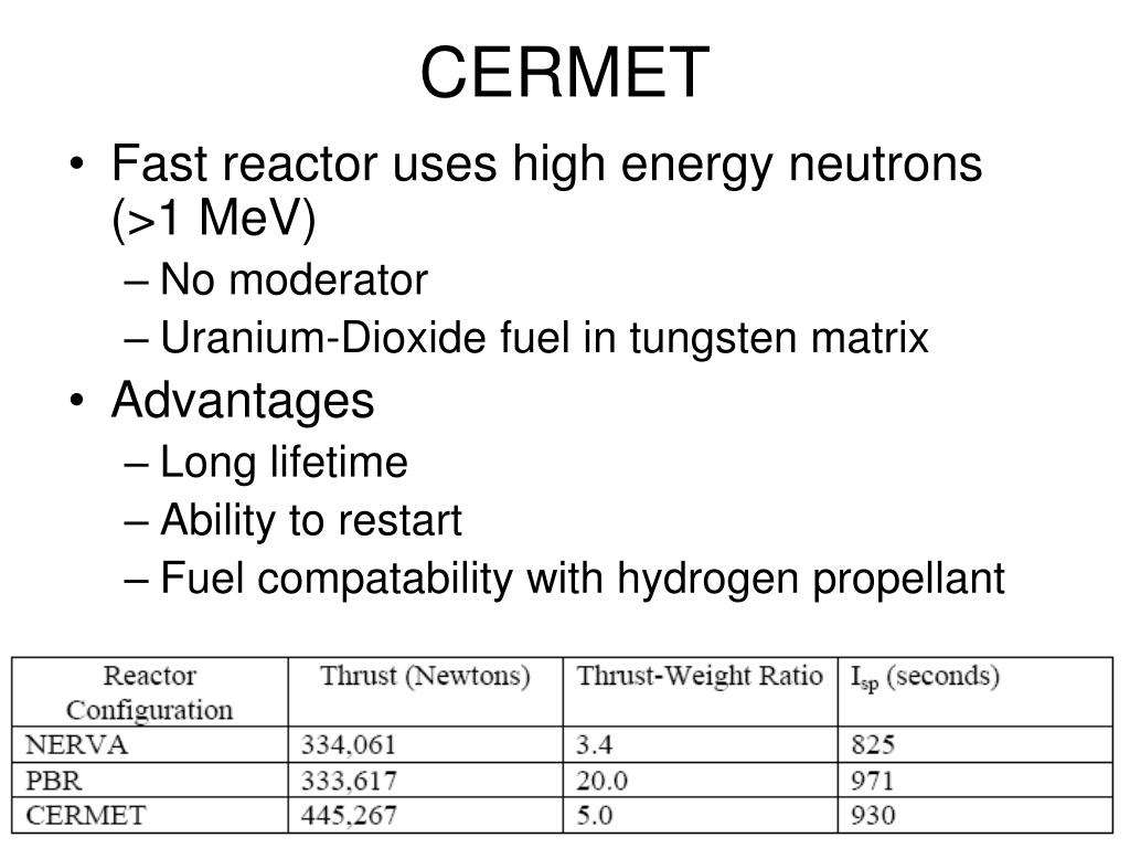 CERMET • Fast reactor uses high energy neutrons (>1 MeV) • No moderator • Uranium-Dioxide fuel in tungsten matrix • Advantages • Long lifetime • Ability to restart • Fuel compatability with hydrogen propellant