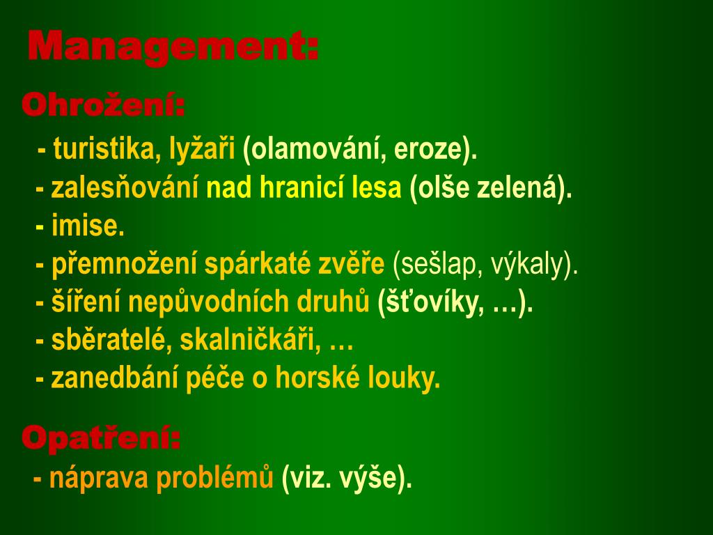 Management: Ohrožení: - turistika, lyžaři(olamování, eroze). - zalesňování nad hranicí lesa (olše zelená). - imise. - přemnožení spárkaté zvěře (sešlap, výkaly). - šíření nepůvodních druhů (šťovíky, …). - sběratelé, skalničkáři, … - zanedbání péče o horské louky. Opatření: - náprava problémů (viz. výše).