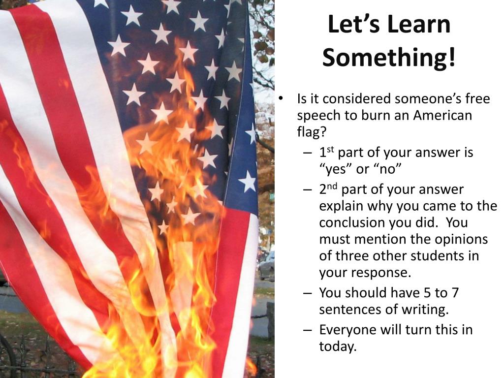 Let’s Learn Something! • Is it considered someone’s free speech to burn an American flag? • 1st part of your answer is “yes” or “no” • 2nd part of your answer explain why you came to the conclusion you did. You must mention the opinions of three other students in your response. • You should have 5 to 7 sentences of writing. • Everyone will turn this in today.