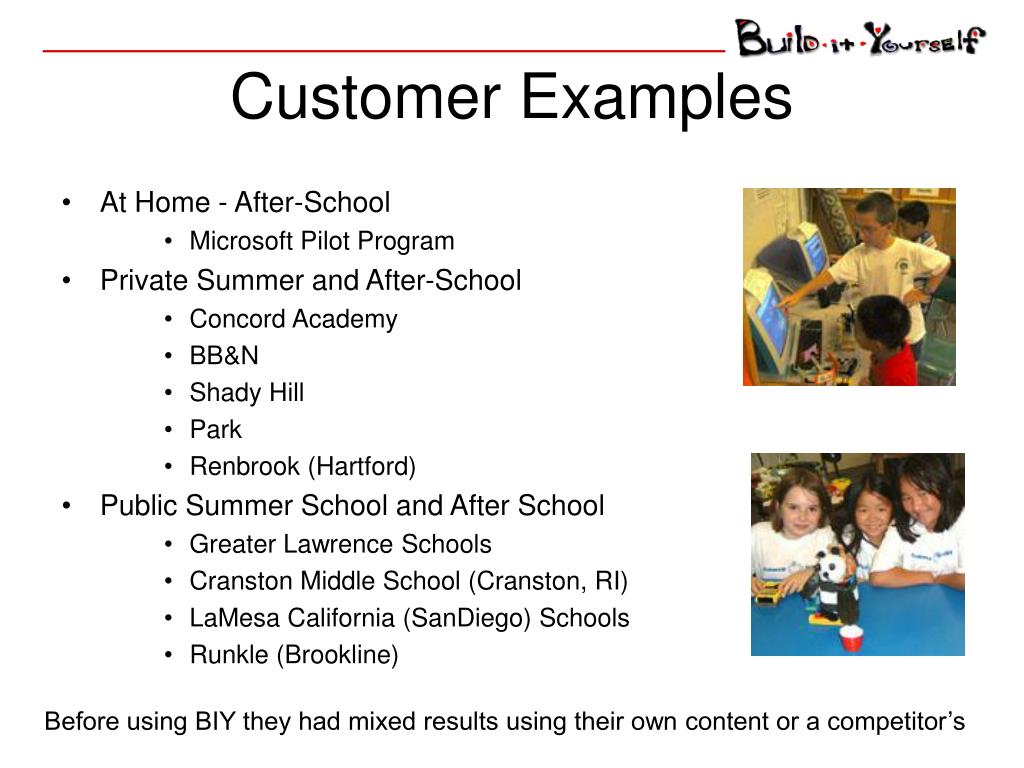 Customer Examples • At Home - After-School • Microsoft Pilot Program • Private Summer and After-School • Concord Academy • BB&N • Shady Hill • Park • Renbrook (Hartford) • Public Summer School and After School • Greater Lawrence Schools • Cranston Middle School (Cranston, RI) • LaMesa California (SanDiego) Schools • Runkle (Brookline) Before using BIY they had mixed results using their own content or a competitor’s