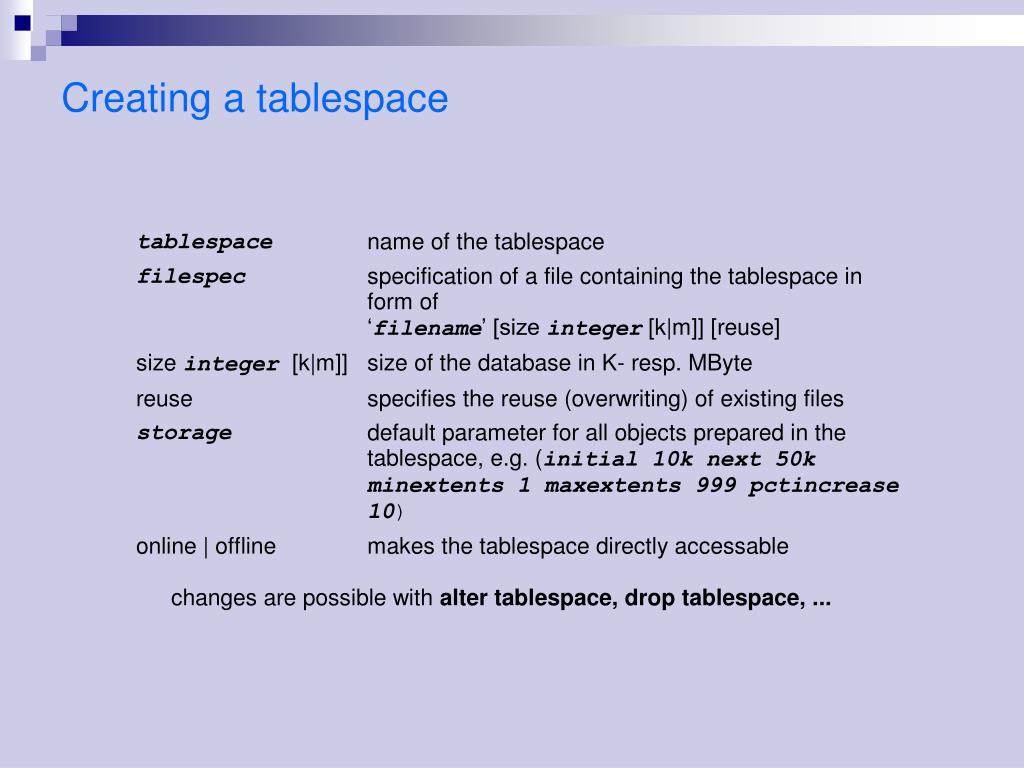 Structure of a tablespace • types of objects resp. kinds of segments in a tablespace: • tables (data segments) • indexes (index segments) • rollback segments • temporary segments • each table, index, rollback segment is assigned to exactly one segment in the concerning tablespace; temporary segments will be created by Oracle • assignment to a tablespace depends on • tablespace of the objects owner • owner options • options in the create statement of the object