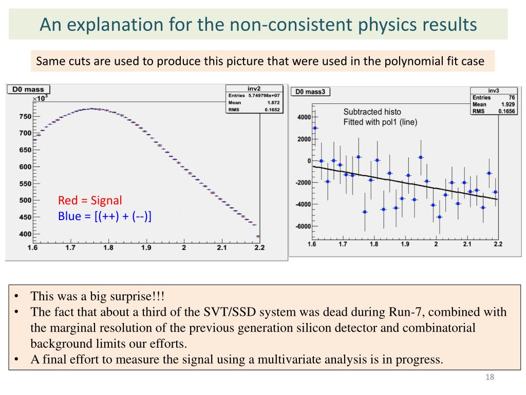 An explanation for the non-consistent physics results Same cuts are used to produce this picture that were used in the polynomial fit case Red = Signal Blue = [(++) + (--)] • This was a big surprise!!! • The fact that about a third of the SVT/SSD system was dead during Run-7, combined with the marginal resolution of the previous generation silicon detector and combinatorial background limits our efforts. • A final effort to measure the signal using a multivariate analysis is in progress.