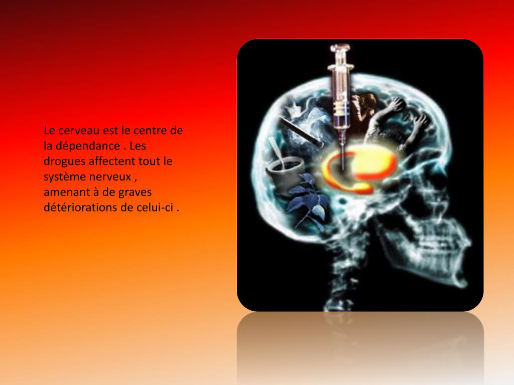Le cerveau est le centre de la dépendance . Les drogues affectent tout le système nerveux , amenant à de graves détériorations de celui-ci .