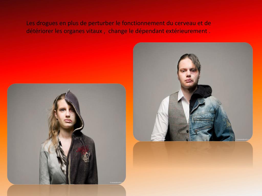 Les drogues en plus de perturber le fonctionnement du cerveau et de détériorer les organes vitaux , change le dépendant extérieurement .