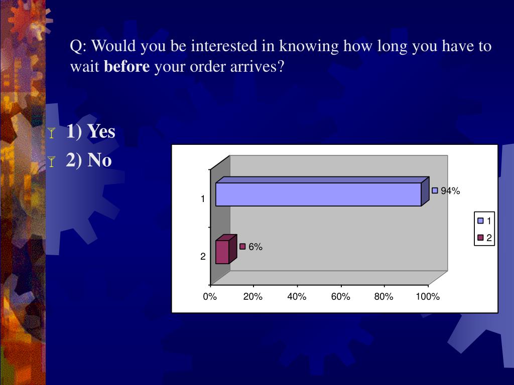 Q: Would you be interested in knowing how long you have to wait before your order arrives? 1) Yes 2) No